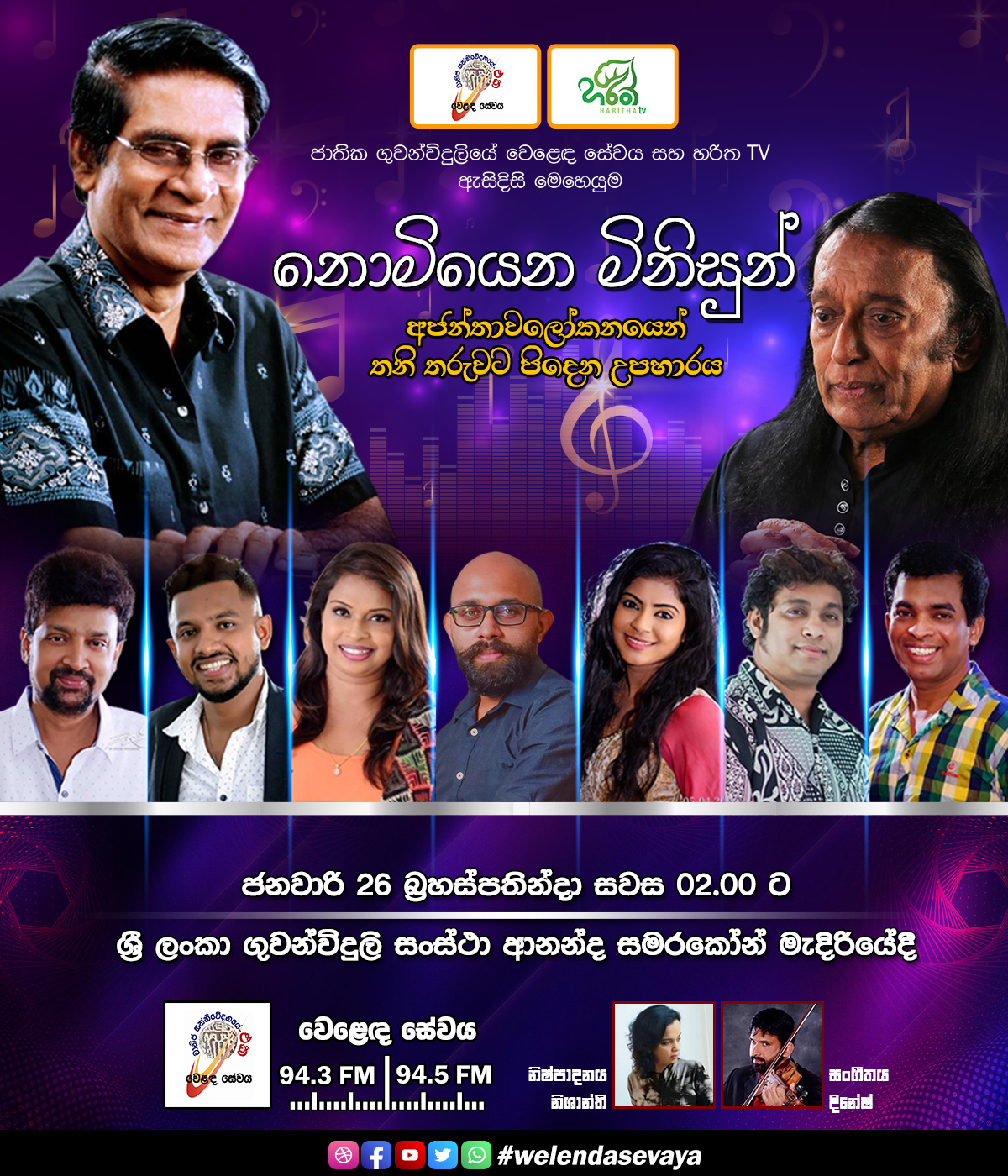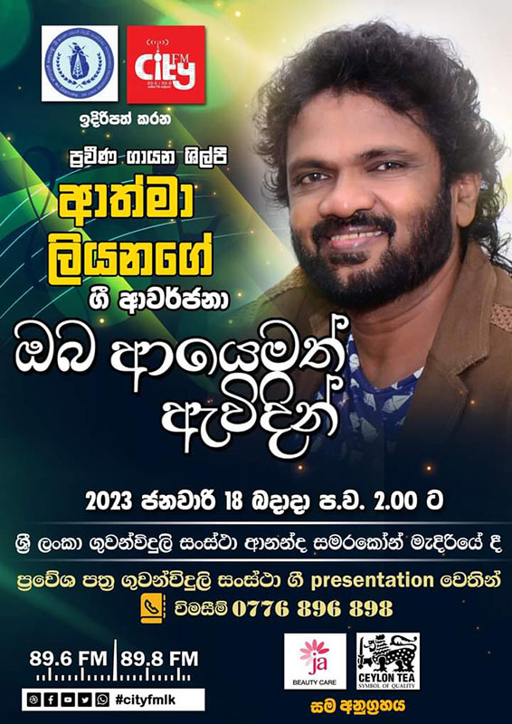 ඔබ ආයිමත් ඇවිදින්.... ප්රවීණ ගායන ශිල්පී ආත්මා ලියනගේ ගී ආවර්ජනා.... ශ්රී ලංකා ගුවන් විදුලි සංස්ථාවේ ආනන්ද සමරකෝන් මැදිරියේදී 2023 ජනවාරි මස 18 වන දින පස්වරු 2.00ට පැවැත්වේ.