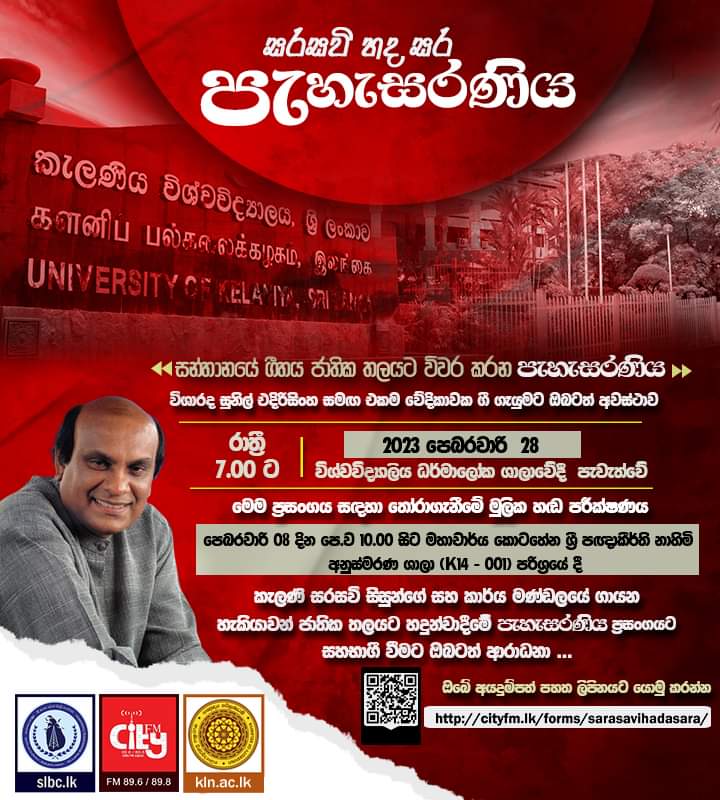 කැලණි සරසවි සිසුන්ගේ සහ කාර්ය මණ්ඩලයේ ගායන හැකියාවන් ජාතික තලයට ගෙන ඒමේ අරමුණින් ප්රවීණ ගායන ශිල්පී සුනිල් එදිරිසිංහයන්ගේ සහභාගිත්වයෙන් පෙබරවාරි 28 වන දින කැලණිය සරසවියේදී සරසවි හදසර පැහැසරණිය ප්රසංගය පැවැත්වේ.
